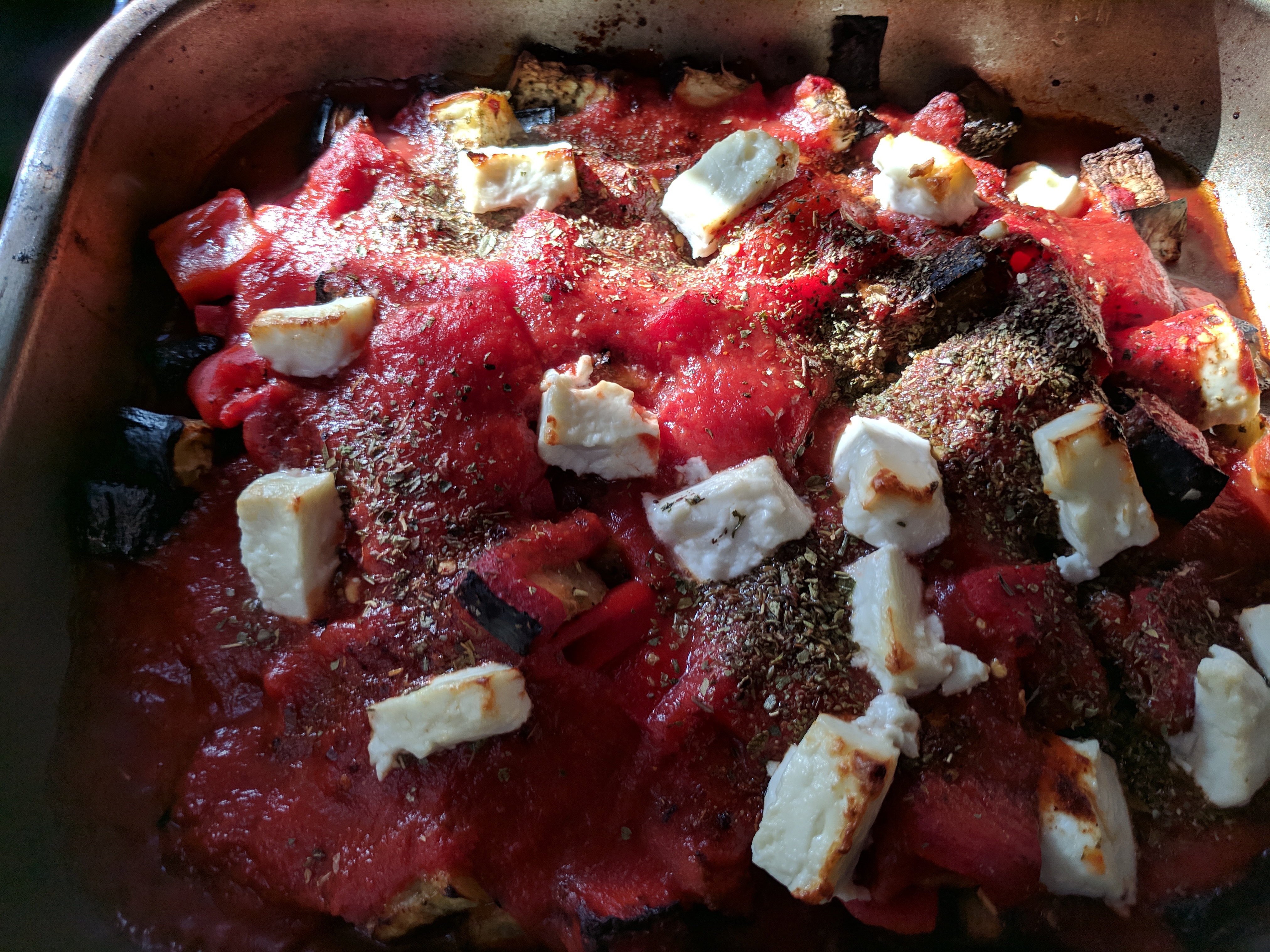 Remove from the oven. Mix the garlic with the tomatoes and pour over. Add the chilli and Oregano and crumble over the feta. Place back in the oven for 10 to 15 mins until the feta is melted.